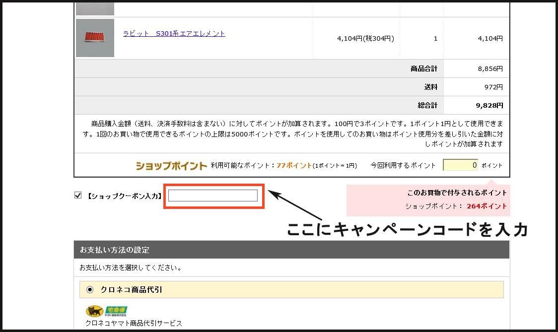 ショッピングカートを進んで行きますとクーポン番号入力蘭が在りますので